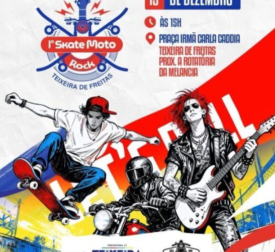 A Prefeitura de Teixeira de Freitas, em parceria com o Motoclub de Teixeira, promove no próximo sábado, 13 de dezembro, o 1º Skate Moto Rock, na Praça Carla Caddia. O evento reúne esporte, cultura urbana e música em uma programação aberta ao público.